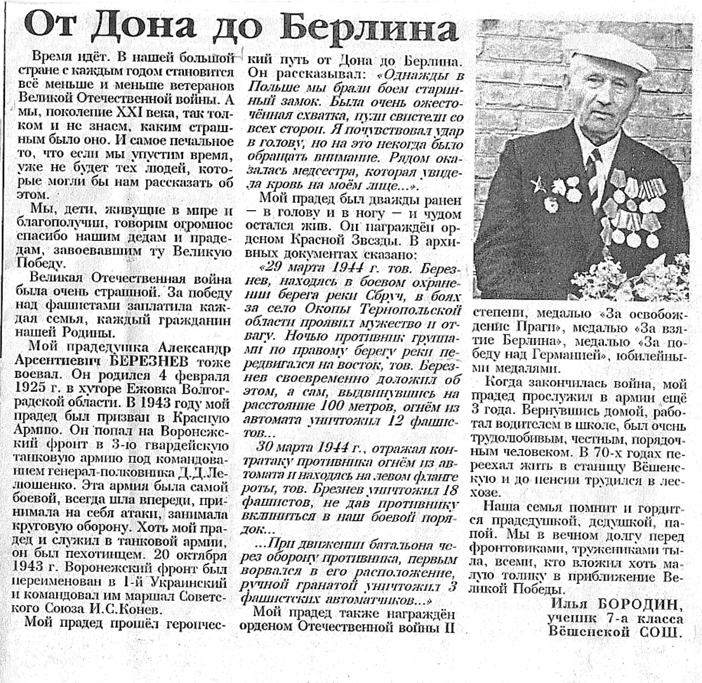 Березнев Александр Арсентиевич родился 04 февраля 1925 года в хуторе Ежовка Волгоградской области. В 1943 году он был призван в Красную Армию и направлен на Воронежский фронт в 3-ю Гвардейскую танковую армию под командованием генерал-полковника Д.Д. Лелюшенко. Александр Арсентиевич служил в звании старшего сержанта, был помощником командира пулеметного взвода.