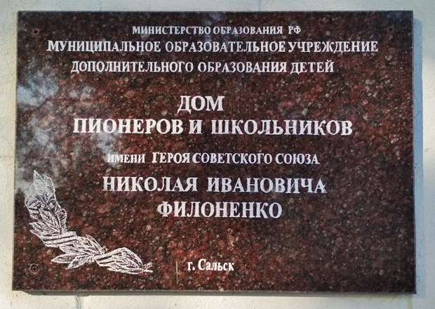 На улице Свобода в г. Сальке, установлена Памятная стела с барельефом Филоненко Н.И. на Аллее Героев.