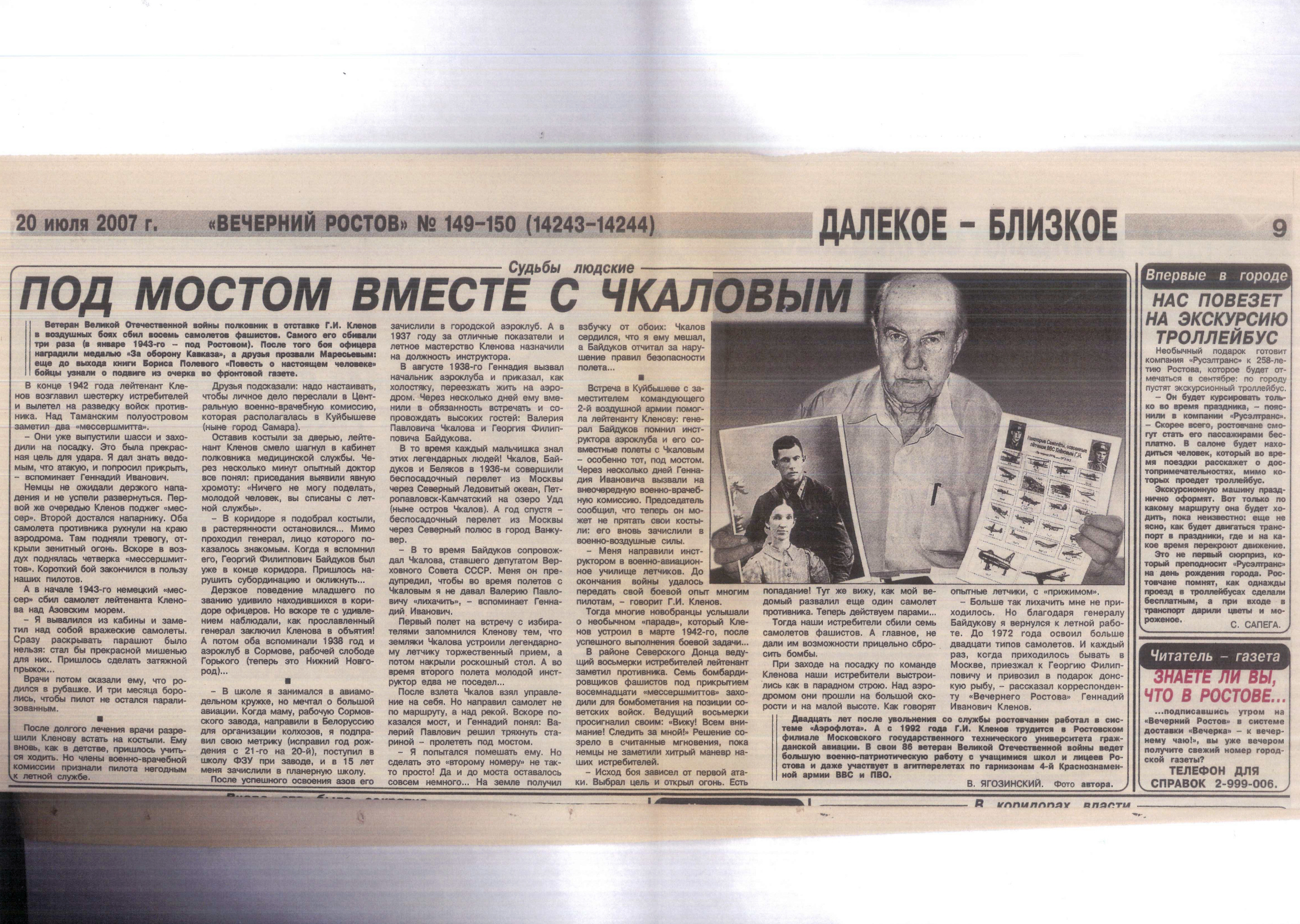 Из воспоминаний Геннадия Ивановича об одном из заданий. «За всю войну я только однажды видел немца — чтобы вот так, глаза в глаза. При обороне Ростова, это был октябрь 41-го. Мы с напарником вернулись с задания, только сели ужинать, вызывает начальник напарника моего и говорит, что требуется разведка в линии фронта. Проходит время, уже должен и садиться — нет его. Сбили. Вызвали меня, приказали взлетать. Я пролетел Таганрог, направляясь вдоль Донецка, визуально определили, какие части стоят наземные, где танки и возвращаюсь. Иду, значит на высоте 300 метров, смотрю, справа - «мессершмитт», и из него мне летчик машет: мол, садись. И сверху истребитель, и снизу в «клещи» взяли. Это они так издевались, насмешничали. Ну я молодой был, 19 лет… резко убрал газ, уменьшил скорость — и под брюхо ему. Дал огонь и отрубил хвост. А потом на правое крыло, скольжением, и к земле. Ушел.»