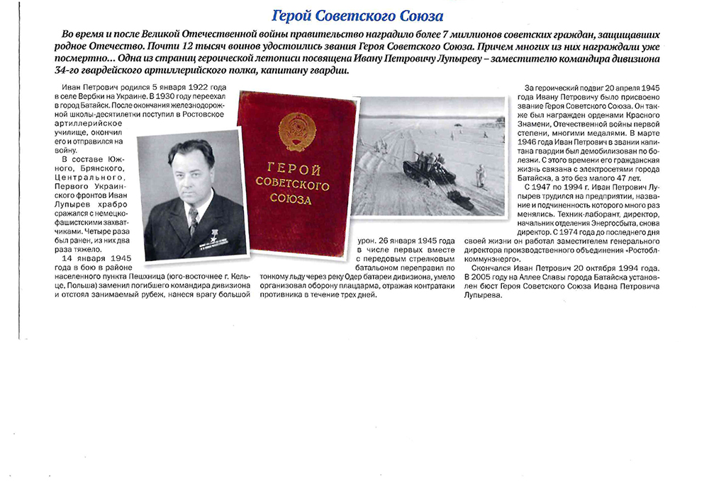 За героический подвиг 20 апреля 1945 года Ивану Петровичу было присвоено звание Героя Советского Союза. Он также награжден орденами Красного Знамени, Отечественной войны первой степени, многими медалями. В марте 1936 года Иван Петрович в звании капитана гвардии был демобилизован по болезни. С этого времени эта гражданская жизнь связана с электросетями города Батайска, а это без малого 47 лет.