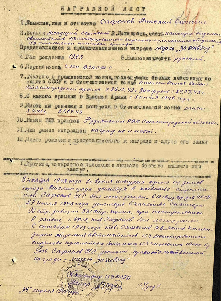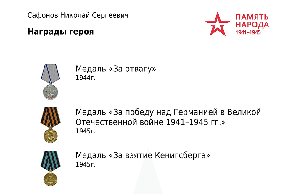Сафонов Николай Сергеевич родился 05.09.1923 г. в Сталинградской области, селе Матышево. Был призван в ряды Советской Армии младшим сержантом, в конце 1941 года. Служил в 153-й танковой бригаде: 331 стрелковом полку 96 стрелковой дивизии (III). Участвовал в Сталинградской битве, дошел до Кёнигсберга, где получил ранение осколком в спину, с которым прожил всю оставшуюся жизнь.