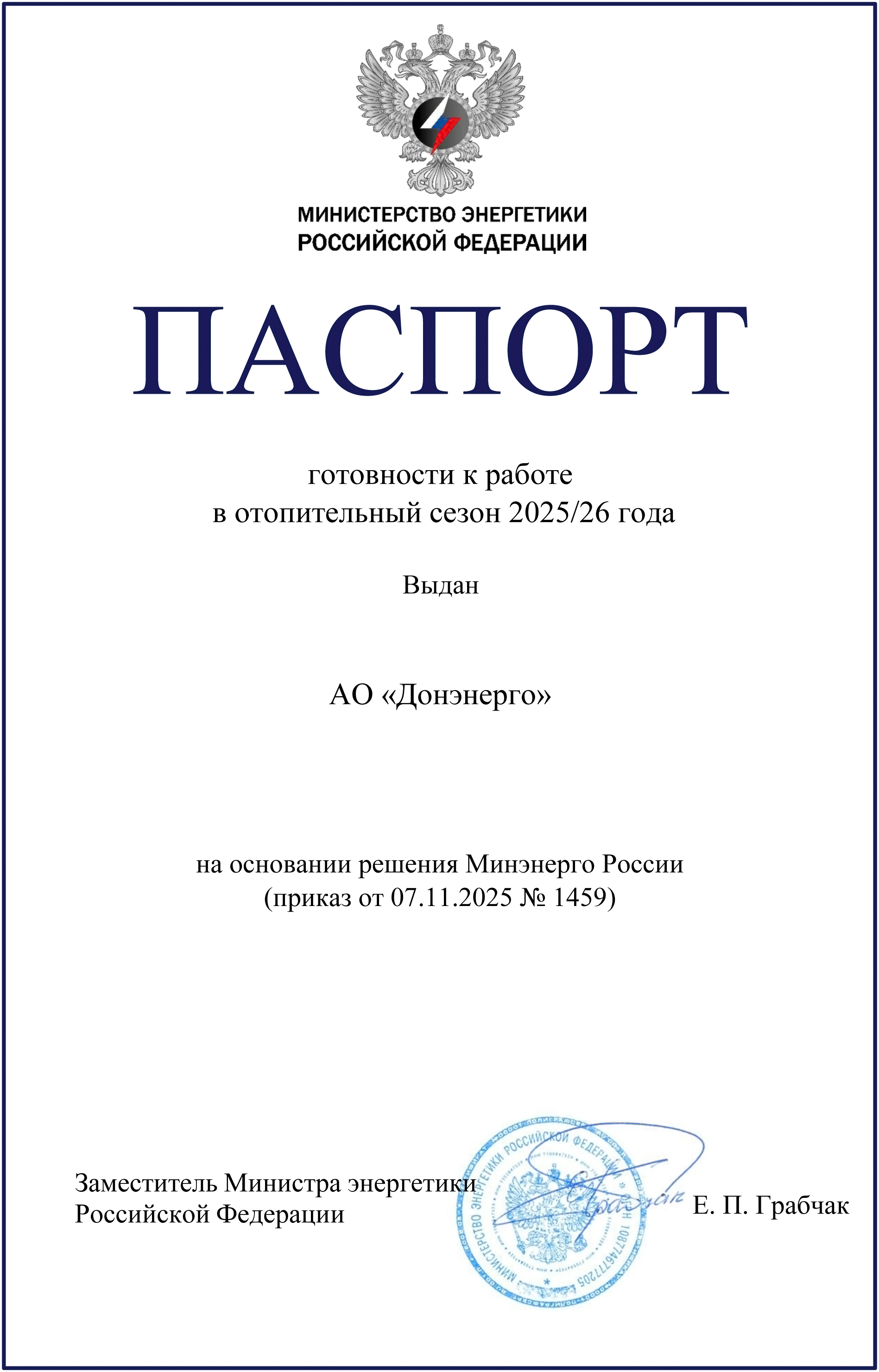 По итогам проведенных работ Министерством энергетики Российской Федерации выдан паспорт готовности АО «Донэнерго» к отопительному сезону 2025-2026 годов (приказ Минэнерго РФ от 07.11.2025 №1459).