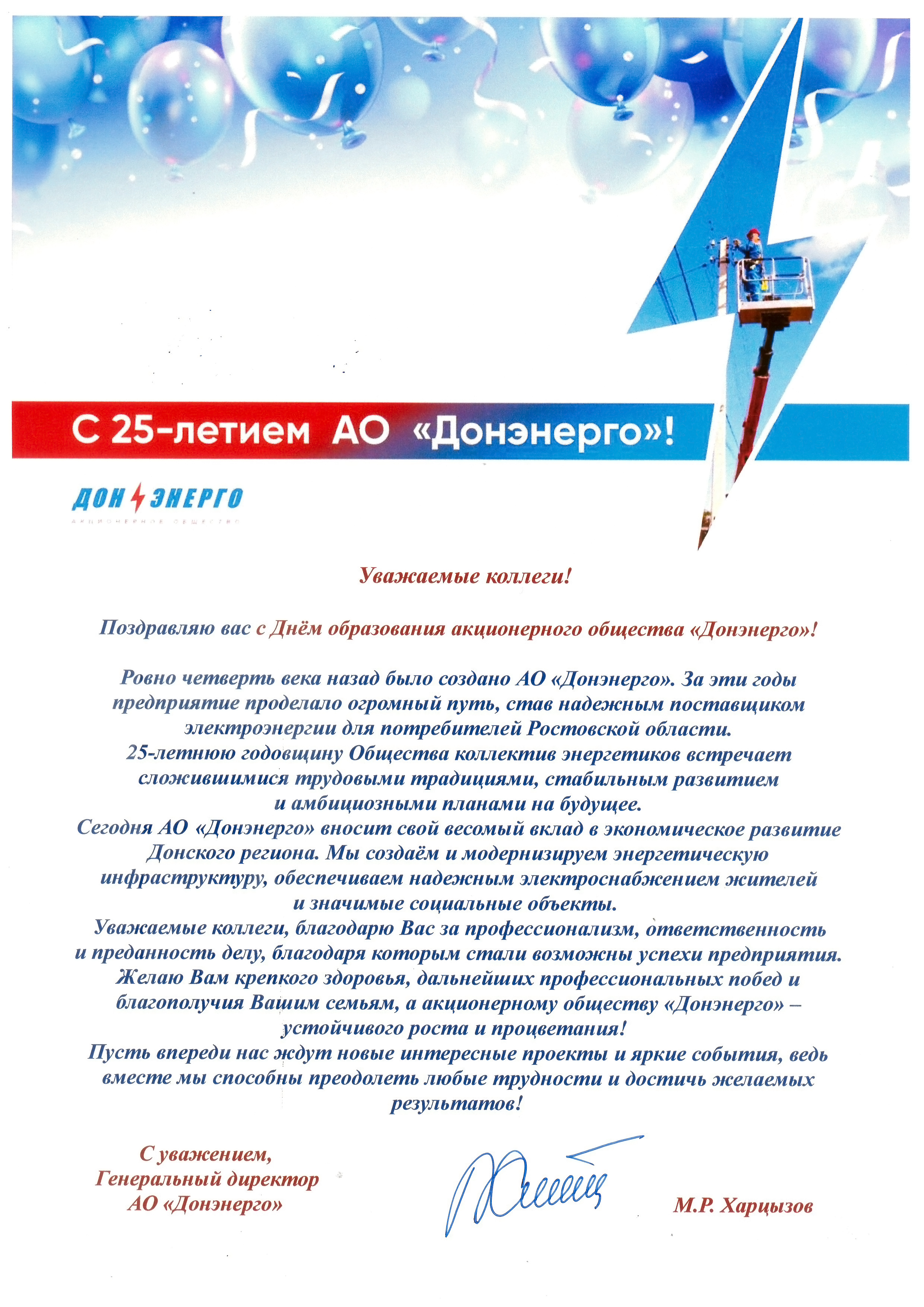 Поздравление генерального директора АО "Донэнерго" М.Р. Харцызова с 25-летием создания Общества