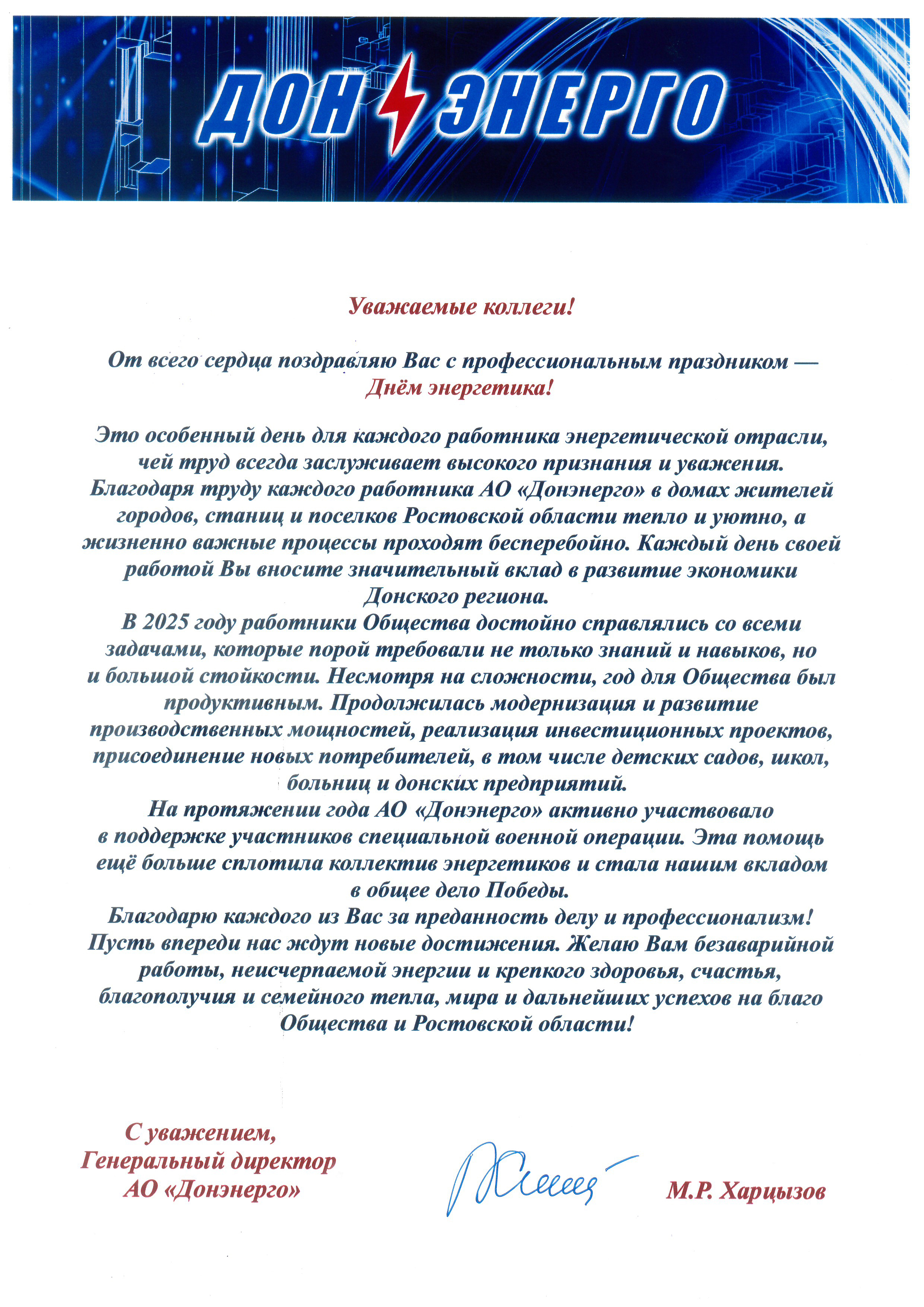 Поздравление генерального директора АО «Донэнерго» М.Р. Харцызова с Днем энергетика