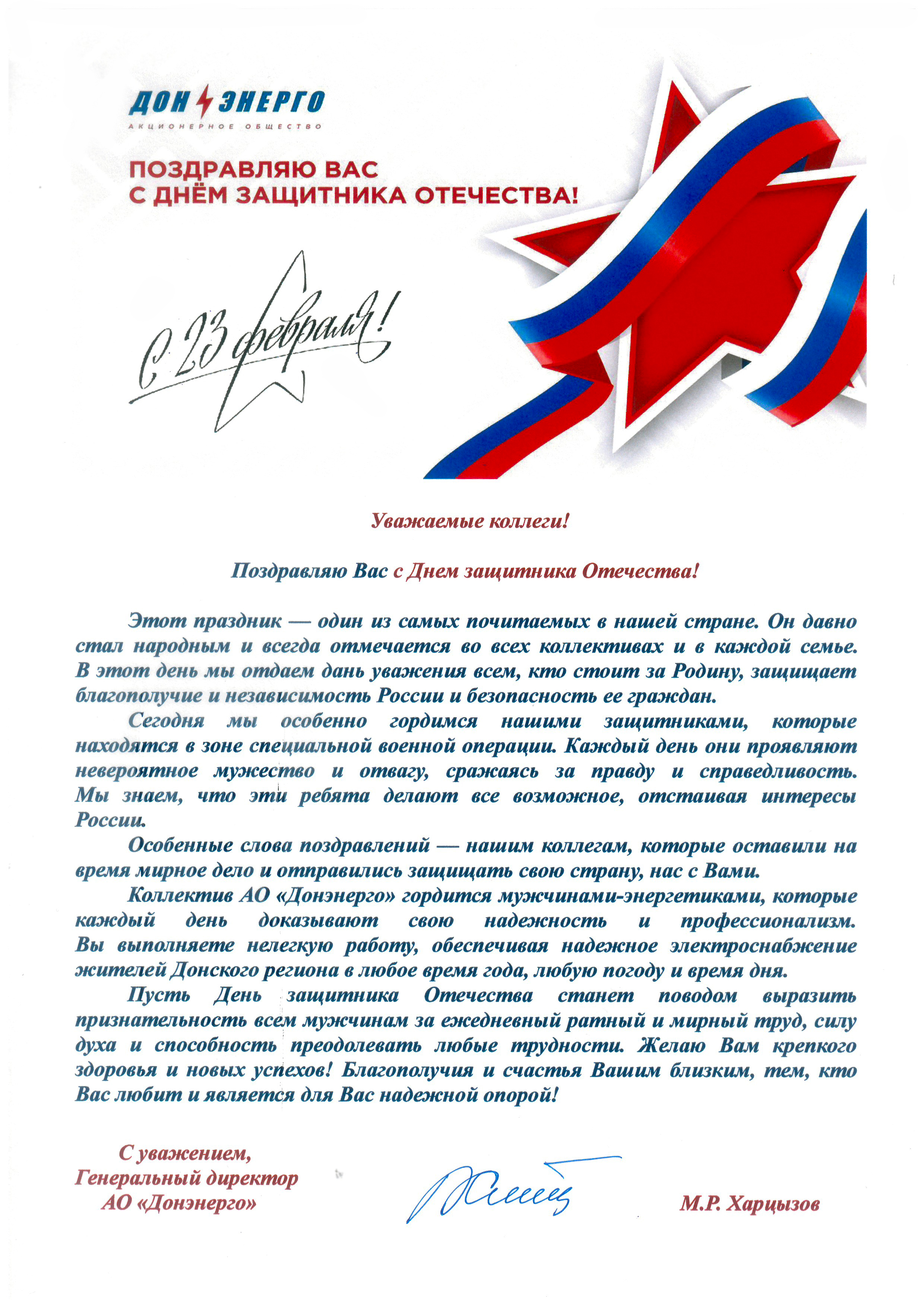 Поздравление генерального директора АО «Донэнерго» М.Р. Харцызова с Днем защитника Отечества